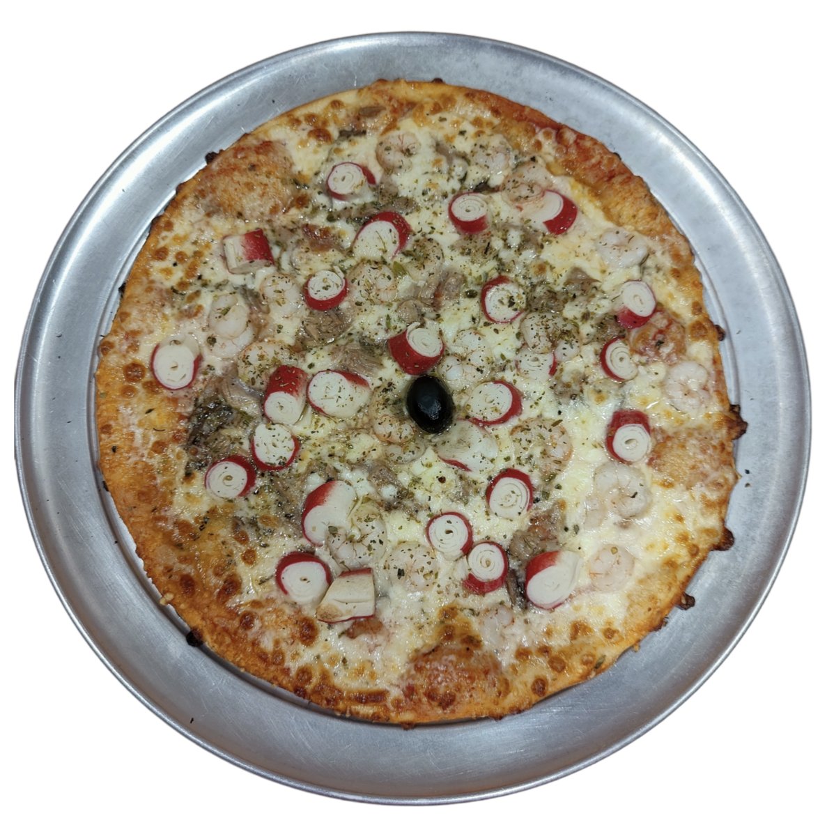 Ingredientes: Tomate, queso, anchoas, atún, cebolla, gambas y tronquitos de mar.