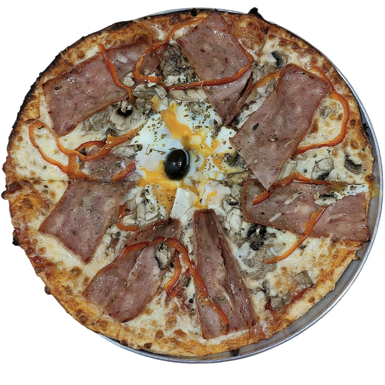 Ingredientes: Tomate, queso, anchoas, atún, cebolla, pimiento rojo, champiñón, huevo y bacon.